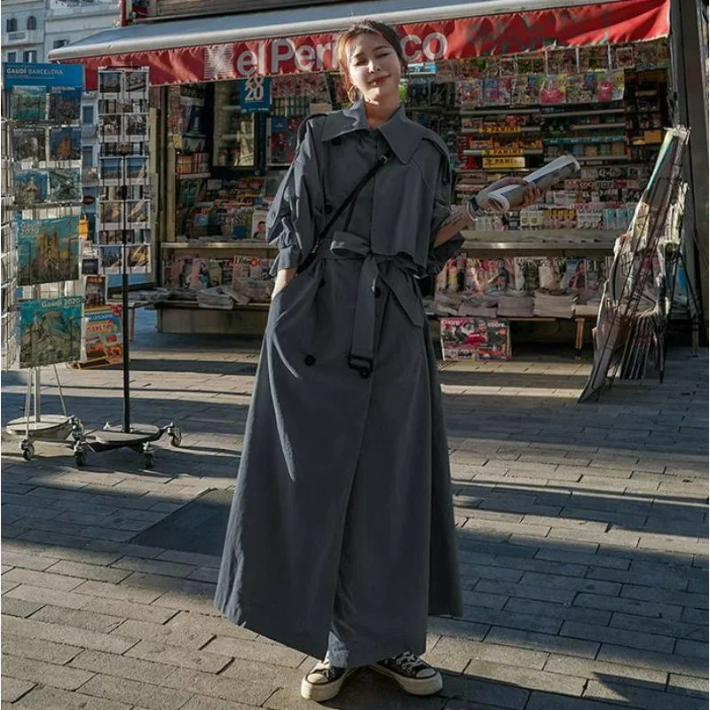 This double-breasted maxi trench coat with belted cuffs for women combines iconic outerwear design with modern proportions. The full-length cut offers sweeping coverage, while tailored details like the notched lapels, waist tie, and adjustable cuffs add polished finish. A standout layer for transitional weather and styled moments.