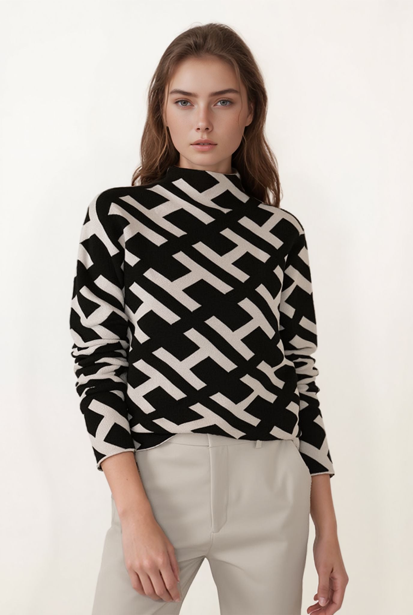 This geometric pattern high neck knit sweater for women adds a graphic edge to your seasonal wardrobe. The high neckline offers extra coverage, while the bold pattern brings standout detail. Pair it with denim, trousers, or skirts for a look that blends comfort with personality.