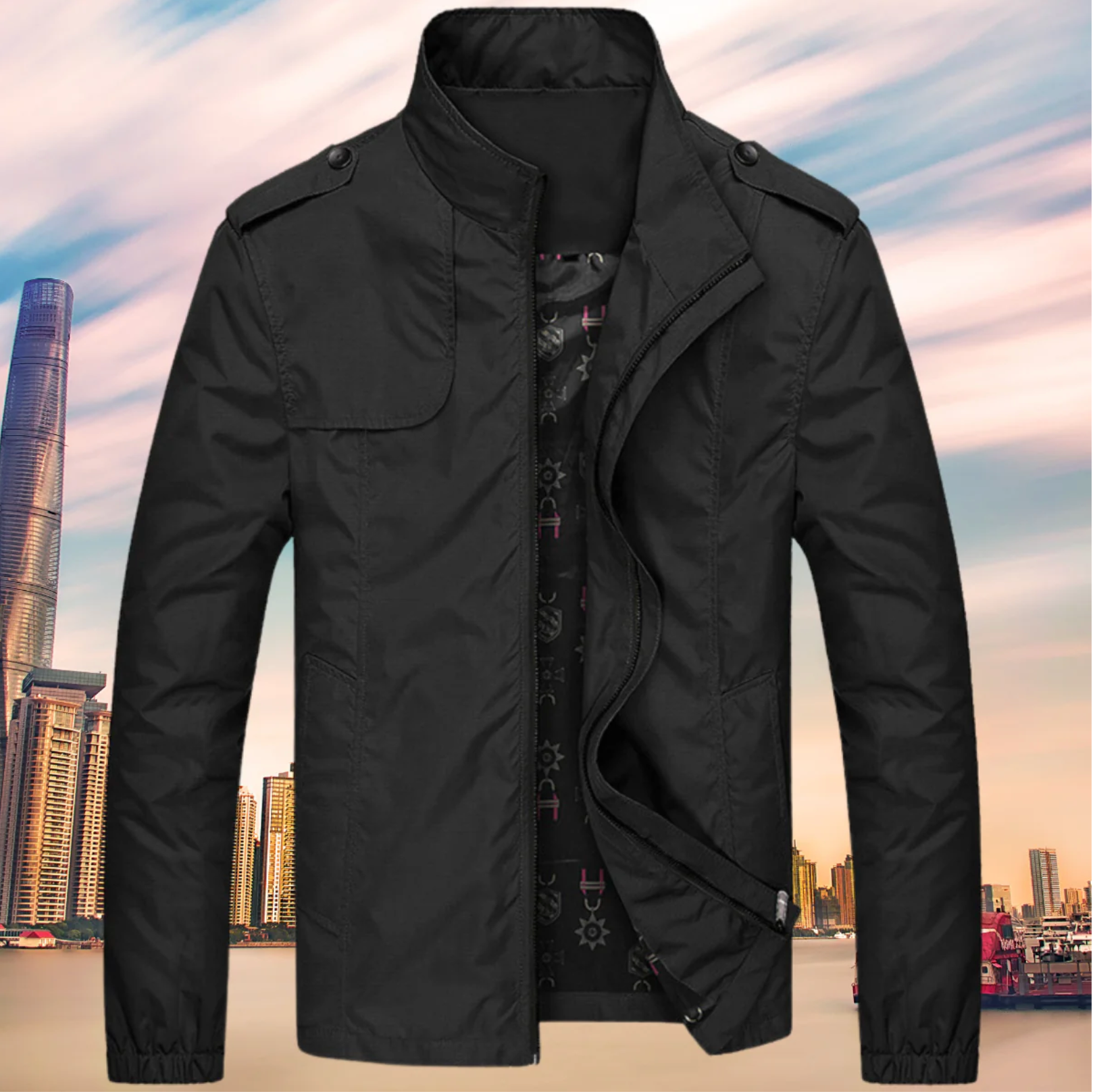 This lightweight stand collar windbreaker jacket with epaulettes for men blends clean lines with functional detail. The stand-up collar and shoulder epaulettes add a structured edge, while the lightweight fabric makes it ideal for layering on breezy days. A go-to outer layer for modern, casual looks.