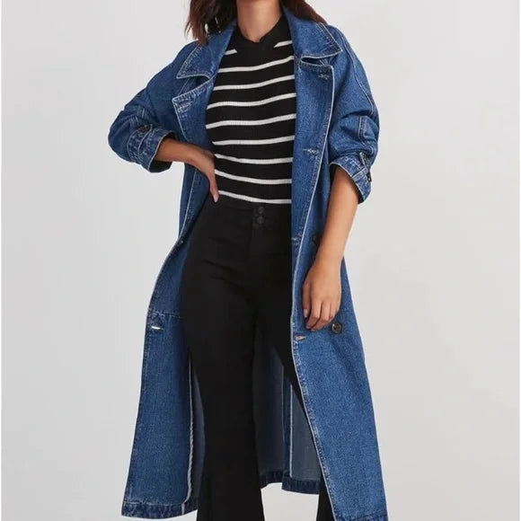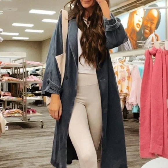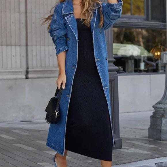 This long denim trench coat for women blends the structure of a classic trench with the relaxed feel of denim. The extended length adds drama and coverage, while the tailored details keep it polished. Whether layered over casual looks or styled for a night out, it’s a standout piece with everyday flexibility.