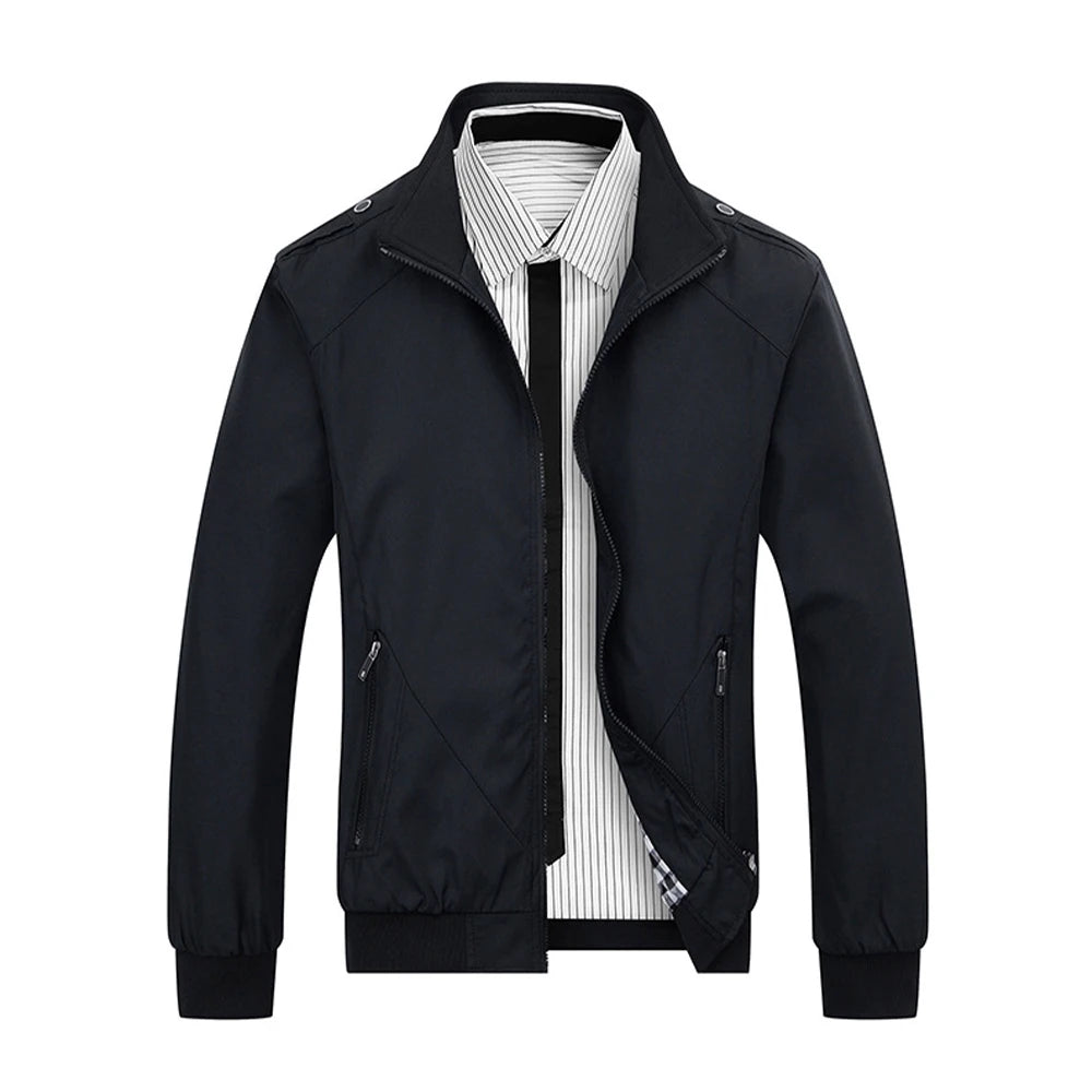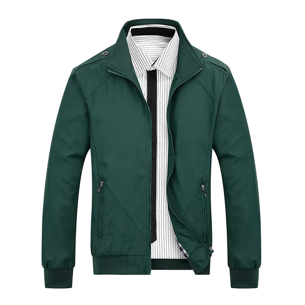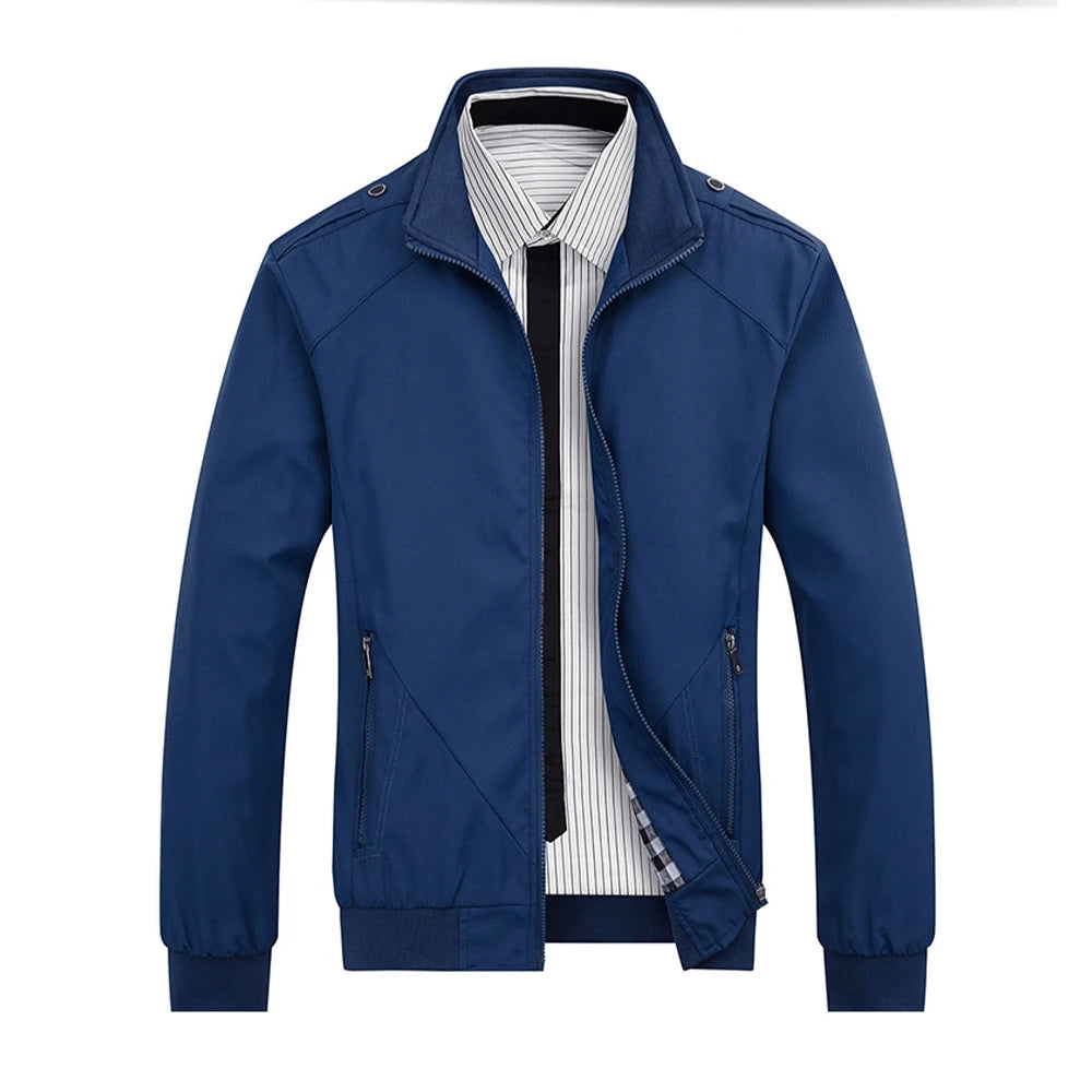 This smart casual zip-up bomber jacket with shirt collar for men blends classic tailoring with laid-back appeal. The structured shirt-style collar adds polish, while the bomber silhouette keeps it relaxed. A versatile piece to layer over tees or button-downs for a clean, put-together look.