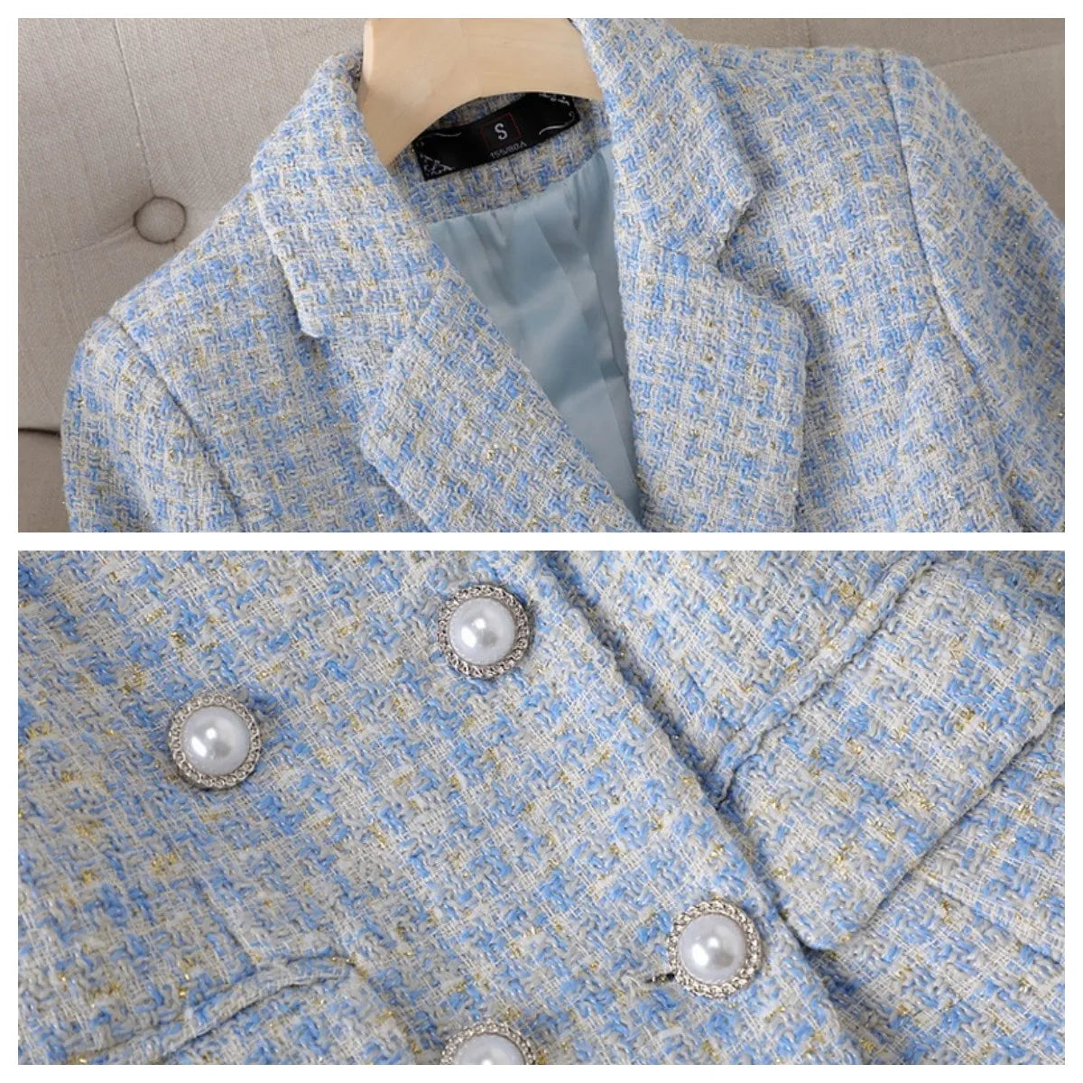 This textured double-breasted tweed blazer for women blends classic charm with a structured silhouette. The woven texture gives it a timeless feel, while the double-breasted front and notched lapels add polished detail. Wear it with denim for contrast or layer over tailored pieces for a confident finish.